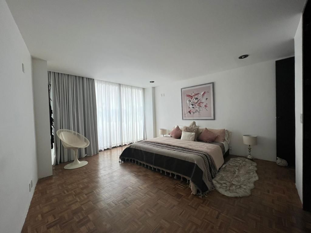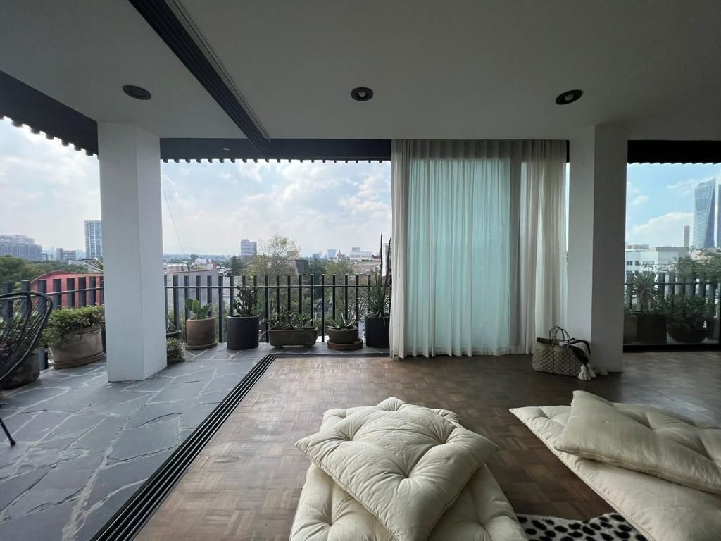 Hermoso departamento modernista en el corazón de la colonia Condesa, a unos pasos del Parque España y Parque México. El departamento cuenta con vista perimetral al Castillo de Chapultepec, a los volcanes y a los mas lindos atardeceres. Amplia cocina equipada con una barra de terrazo para entretener. Cuenta con estudio o cuarto de TV, sala comedor y amplia terraza. 2 habitaciones 2 baños completos 1 lugar de estacionamiento Portero Estación de lavado La recamara principal cuenta con un walk in closet de gran tamaño.