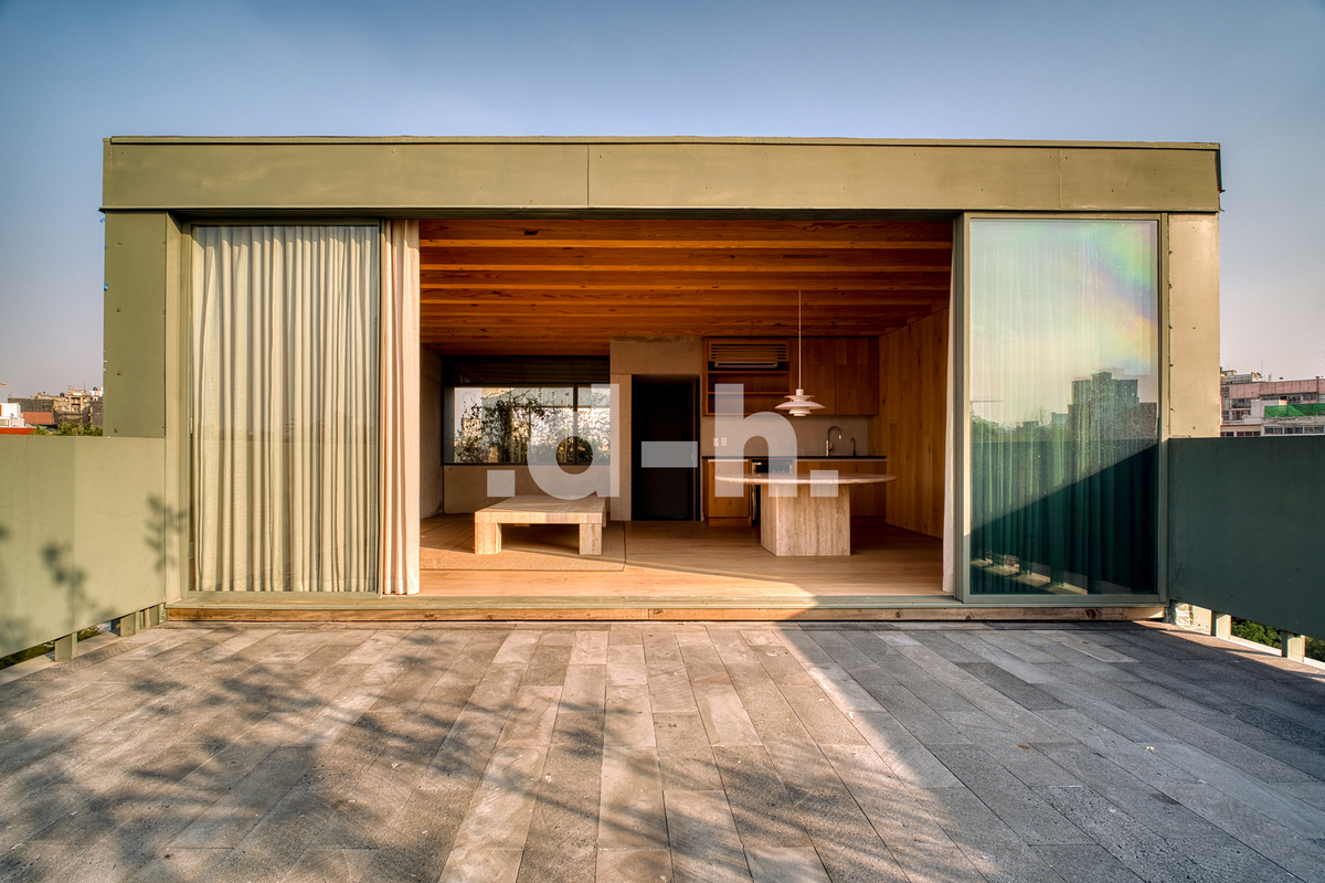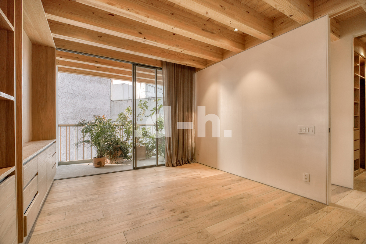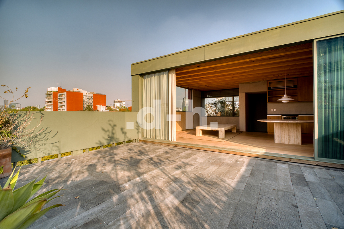 Beautiful interior penthouse at Citla 31, part of a Cerna project in collaboration with Taller Héctor Barroso, designed for balanced and harmonious living. Located one block from Circuito Ámsterdam, Citla 31 stands amidst the vibrant energy of one of Mexico City's most dynamic neighborhoods: La Condesa. This unique project primarily utilizes the highest quality and most durable sustainable woods, creating warm, contemporary, and thoughtfully designed spaces. With a total area of 184.5 m², the penthouse offers two bedrooms, 2.5 bathrooms, a balcony, a private rooftop terrace, and parking. The design integrates terraces and patios, natural materials, cross ventilation, an elevator, 24/7 security, abundant natural light, a water cistern, and a prime location, combining comfort, aesthetics, and functionality for an exceptional lifestyle.